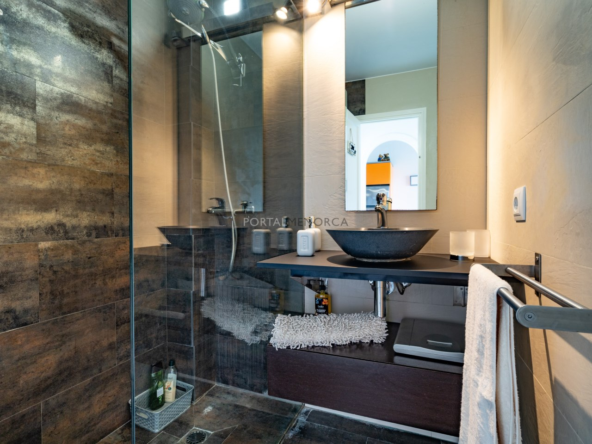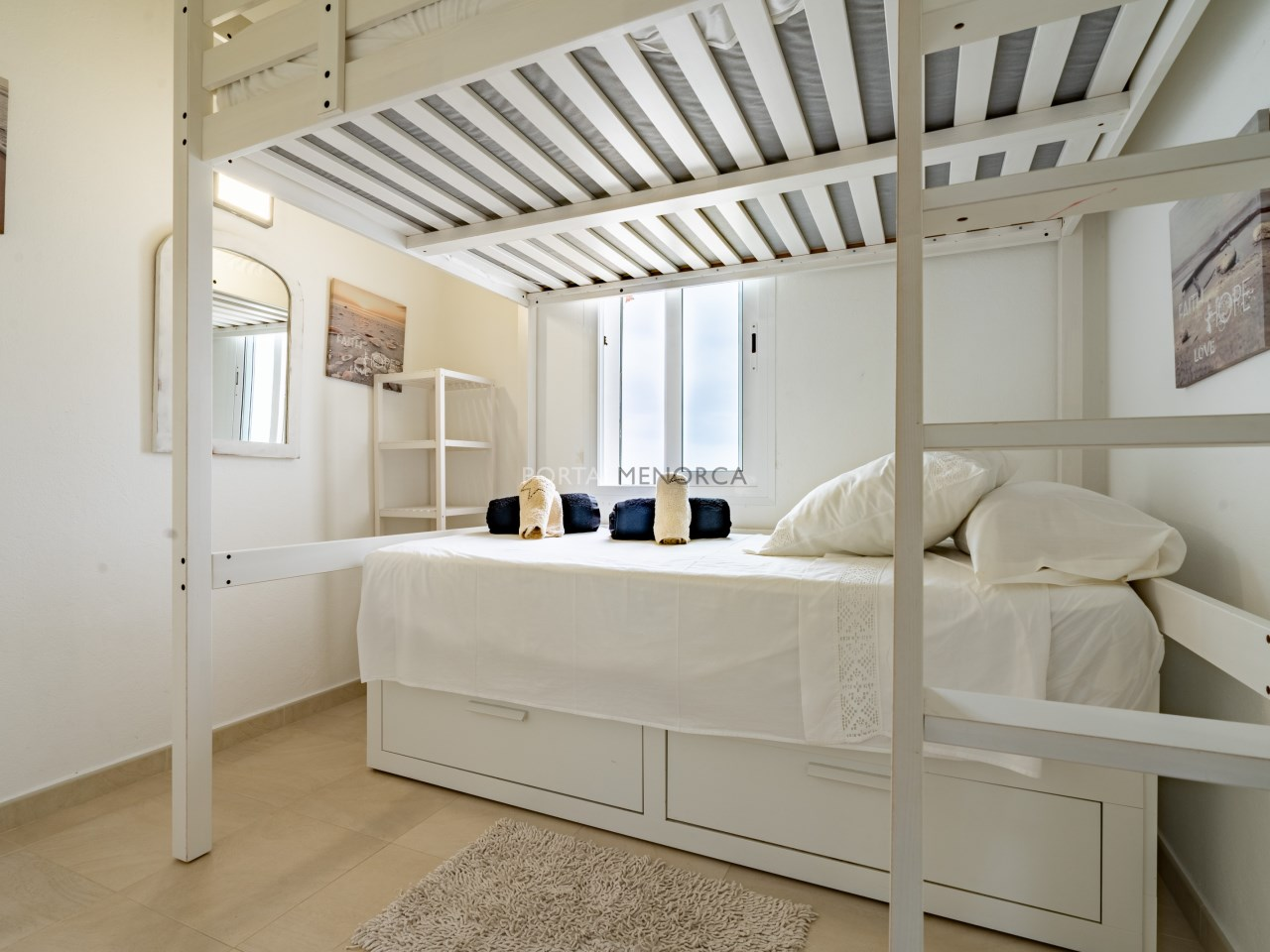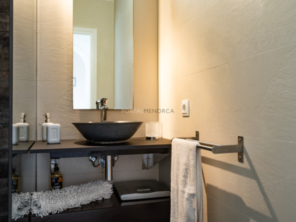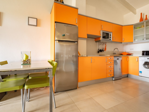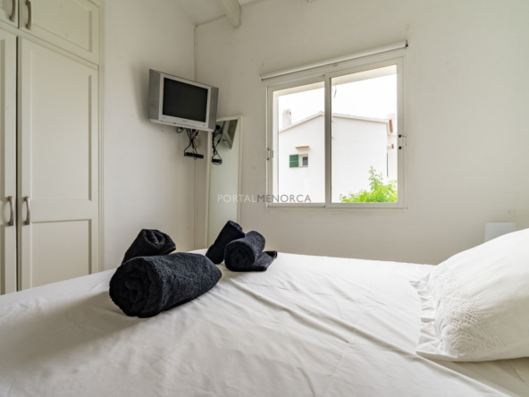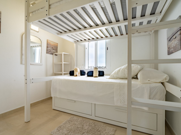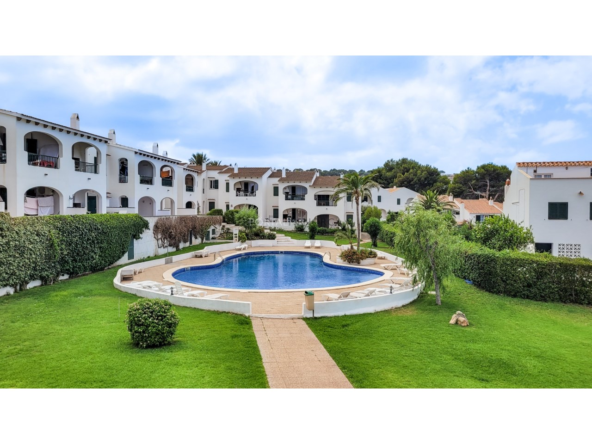 Es una planta primera con una terraza que mira hacia el mar y son unas vistas despejadas hacia Favaritx, el conjunto tiene una piscina muy grande con solárium suficiente para todos los apartamentos, y además incluye una plaza de aparcamiento descubierta.