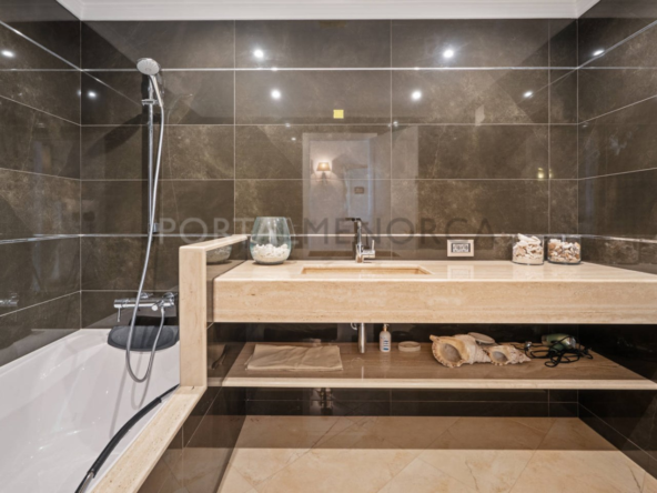 En la planta de acceso, una amplia entrada con pared de mares y escalera de mármol conduce al primer piso. Allí encontramos un gran recibidor, una espaciosa cocina-comedor con salida a una terraza de 37 m², dos dormitorios dobles con acceso a un balcón orientado al sur y un baño completo.