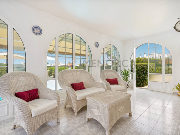 La parcela tiene varias zonas de descanso con un cuidado y bonito jardín, cuenta con una bonita piscina rodeada de una terraza de teka, un patio interior en la parte trasera con zona de barbacoa y escalera que nos conduce a la terraza solárium con vistas al mar.