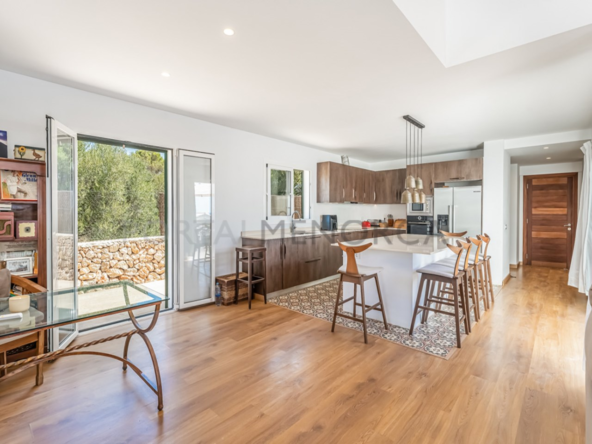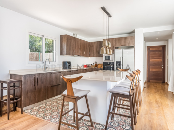 Consta de cocina abierta con isla, integrando los espacios de comedor y salón, todo ello con unas agradables vistas al jardín y la piscina desbordante. Con 3 dormitorios dobles, amplios y luminosos, diseñados para ofrecer el máximo confort y privacidad, 2 baños, 1 aseo y un práctico y funcional lavadero.