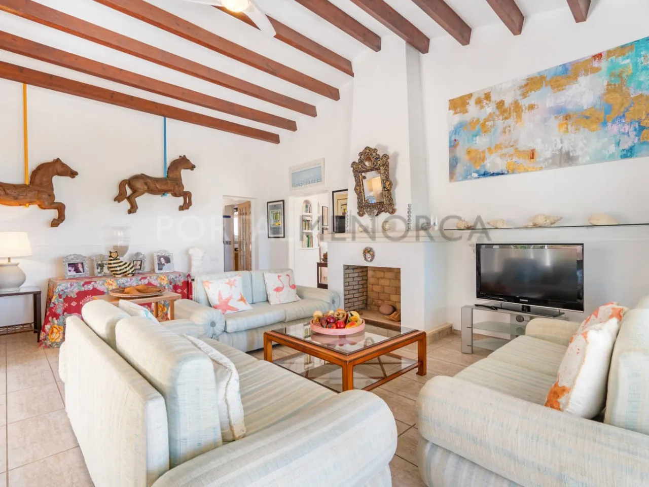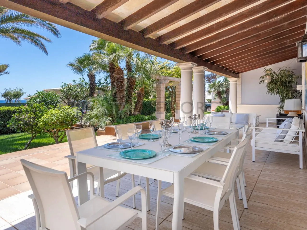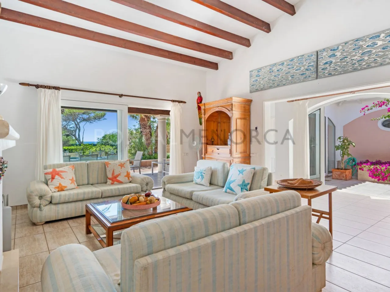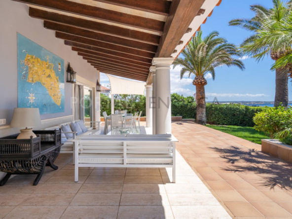 Al acceder a la propiedad, encontramos una amplia terraza cubierta, orientada al sur y con vistas al mar. En el interior, una galería cubierta rodea un patio central y conduce a un espacioso salón con chimenea, donde podrás seguir apreciando las vistas al mar y acceso a la terraza cubierta, dando acceso al comedor y la cocina, que dispone de salida al patio trasero.