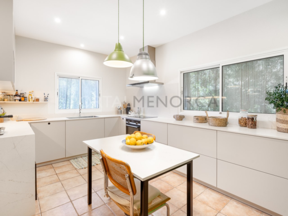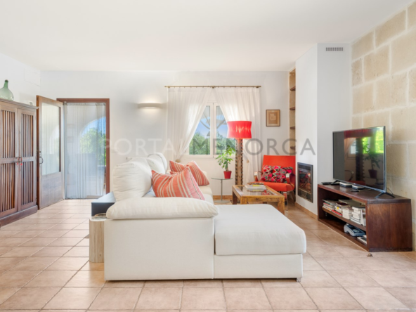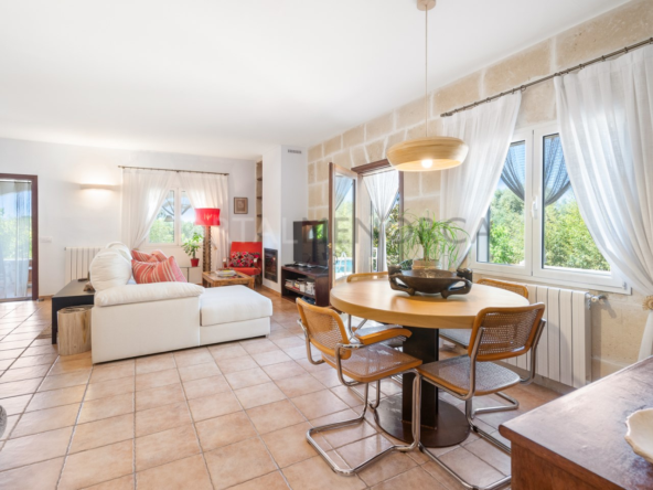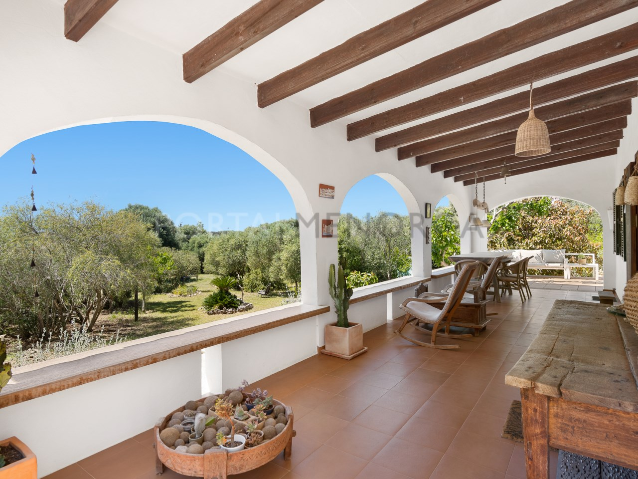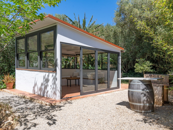 En el exterior encontramos múltiples espacios con ambientes distintos pensados para disfrutar de cada momento: la piscina de agua salada con su terraza rodeada de árboles, un encantador salón acristalado con zona de barbacoa donde poder relajarte, otra zona de taller, el huerto y diversos árboles frutales repartidos por la finca con el antiguo e imponente ullastre como protagonista.