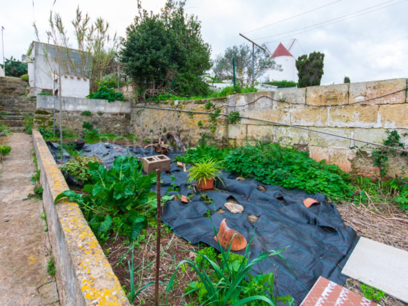 Detrás de la casa hay un jardín escalonado con zona de huerto y terraza con vistas al pueblo, a la iglesia y al molino. Tiene un deposito de agua que recoge el agua de lluvia que sirve para regar. Al lado de la casa hay un amplio sótano con techo abovedado, perfecto como trastero para guardar bicicletas etc.