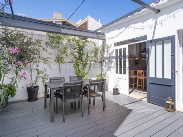 Al principio, encontramos un despacho, luego un dormitorio doble con ducha y un práctico cuarto de baño separado al que se puede acceder también desde el pasillo, otro dormitorio doble y un lavadero situado al fondo del pasillo. Luego, está la cocina con salida a un bonito patio de 24 m2 y la luminosa habitación en suite con baño y vestidor con tocador y con salida directa al patio.