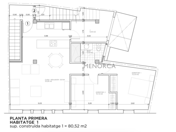 Primera planta: Vivienda de 80 m² con dos dormitorios y un baño.